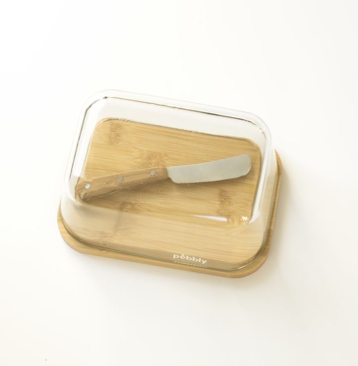 Die Pebbly Butterdose besteht aus Glas und Bambus. Perfekt zum Aufbewahren von Butter im Kühlschrank und zum Servieren am Tisch. Bambus ist ein sehr feuchtigkeitsbeständiges Material. Die dicke Glasabdeckung garantiert eine gesunde Lagerung. Die Butterdose ist für 250 g Butter geeignet. Das mitgelieferte Messer eignet sich perfekt zum Schneiden und Verteilen.