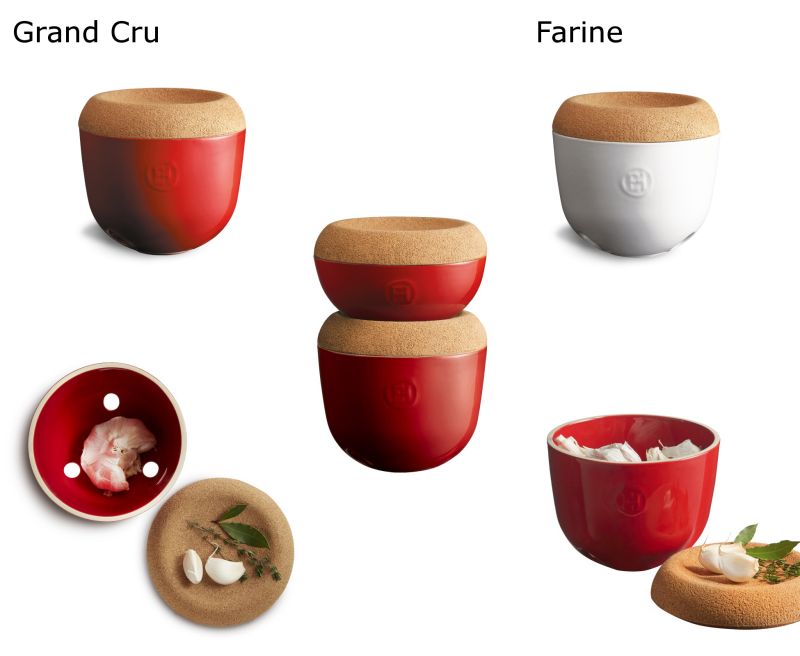Mit einem cleveren Design und natürlichen Materialien mit Eigenschaften, die sich ideal für die Konservierung eignen, bewahrt der Knoblauchtopf von Emile Henry in seiner emaillierten Keramikbasis Knoblauch und andere Gemüse sicher und formschön auf- fern von Licht.