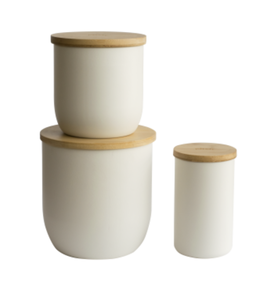 Runde Vorratsdose aus Metall mit Bambusdeckel. Diese Behälter sind ideal für die Aufbewahrung von trockenen Lebensmitteln wie Nudeln, Müsli, Reis, Tee, Zucker, Kaffee usw. Sie bestehen aus Metall mit cremefarbener Lackierung und haben einen Bambusdeckel.