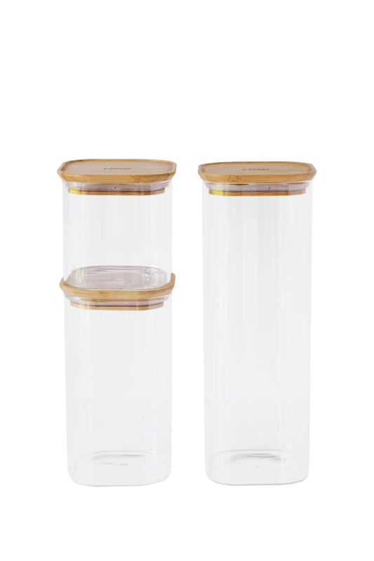 Quadratische Vorratsgläser mit Bambusdeckel. Diese stapelbaren Behälter sind ideal für die Aufbewahrung von trockenen Lebensmitteln wie Nudeln, Müsli, Reis usw. Sie bestehen aus Borosilikatglas und haben einen Bambusdeckel mit Silikondichtung. Durch den gebogenen Deckel können Sie sie stapeln und so Platz in der Küche sparen. Leicht zu reinigen, die Dichtung ist abnehmbar und die Box ist spülmaschinenfest.
