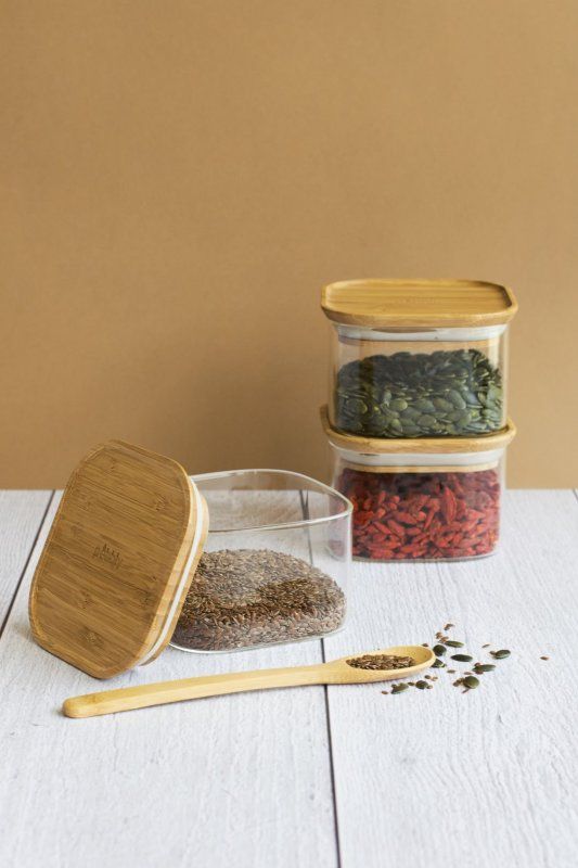 Quadratisches Vorratsglas mit Bambusdeckel. Diese stapelbaren Behälter sind ideal für die Aufbewahrung von trockenen Lebensmitteln wie Nudeln, Müsli, Reis usw. Sie bestehen aus Borosilikatglas und haben einen Bambusdeckel mit Silikondichtung. Durch den gebogenen Deckel können Sie sie stapeln und so Platz in der Küche sparen. Leicht zu reinigen, die Dichtung ist abnehmbar und die Box ist spülmaschinenfest.