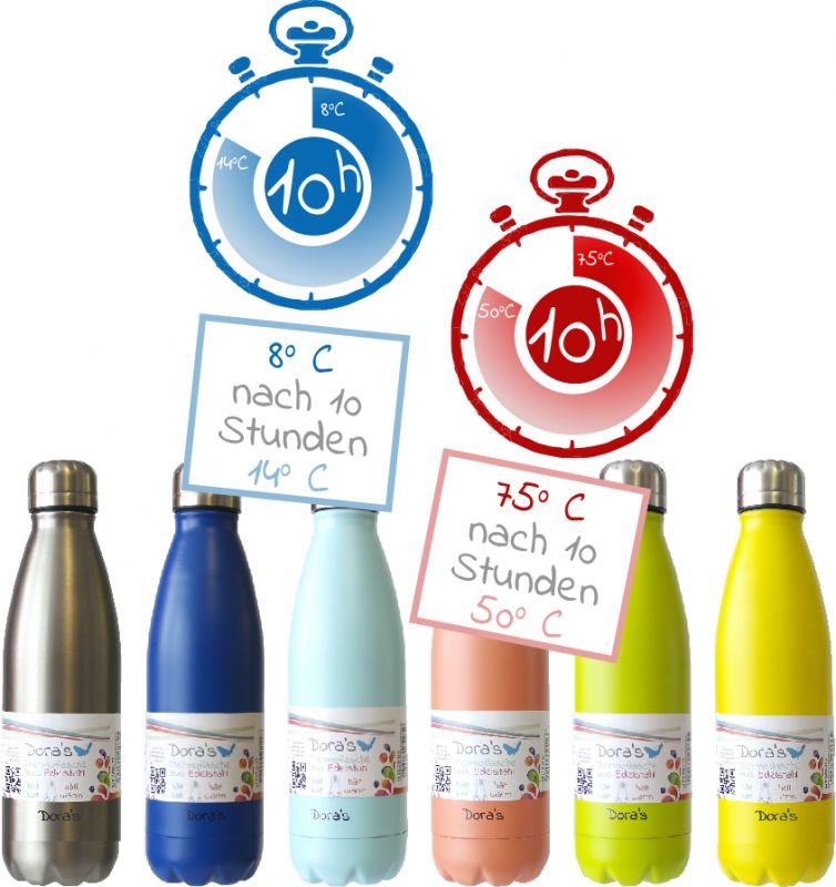 Die Dora's Thermoflasche aus Edelstahl begleitet sich überall hin: In der Schule und zum Studium, im Büro, zum Wandern und Skifahren. Im Sommer hält sie Deine Getränke schön kalt und im Winter warm.