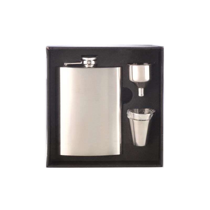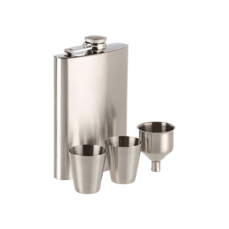 Geschenkset mit Flachmann sowie einem kleinen Trichter zum Befüllen und zwei Bechern aus Edelstahl