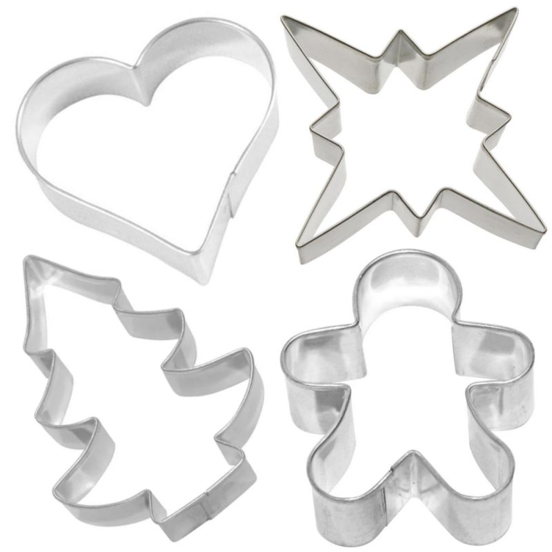 Set besteht aus 4 Ausstechern: Tanne, Stern, Herz und Lebkuchenmann