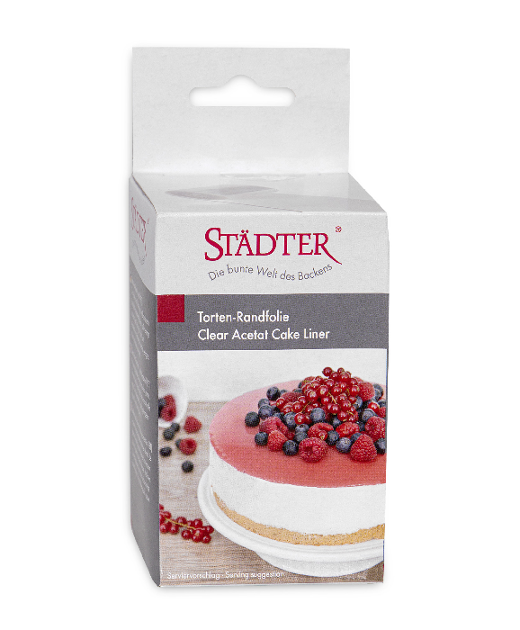 Einfach die Folie auf die entsprechende Länge abschneiden, Enden mit einem Klebstreifen fixieren und verschließen, in den Tortenring oder Backrand einsetzen und schon kann es los gehen.... Schicht für Schicht einfüllen und durchkühlen. Erst den Tortenring abziehen, dann die Folie entfernen, so bleibt die Füllung exakt geschichtet und verschmiert nicht mehr beim Abziehen des Rings.