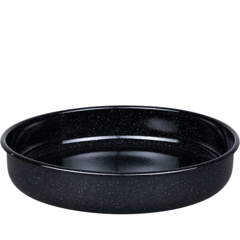 Die runde Bratrohrpfanne mit hohem Rand aus schwarzer Emaille ist auch unter dem Namen Tepsija bekannt..