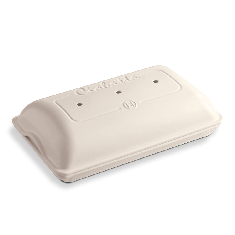 Das Set von Emile Henry bietet die Möglichkeit für 2 Ciabattas mit bis zu 250 g pro Stück. So klappen gut geformte und gleichmäßige Brote ganz leicht. Der gewölbte Deckel hilft außerdem die Feuchtigkeit zu kontrollieren und die ideale Konsistenz zu gewährleisten.