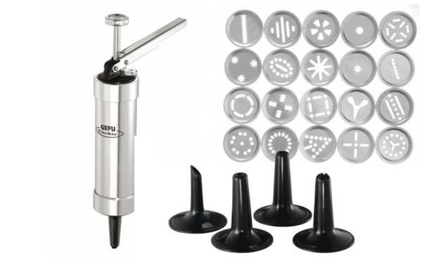 Für ungetrübten Backspaß direkt auf dem Backblech: Exakte Teigportionen durch einstellbare Menge. 20 Motiv-Lochscheiben aus Aluminium, vier Spritztüllen aus ABS-Kunststoff bieten unbegrenzte Möglichkeiten für Gebäck und Verzierungen.