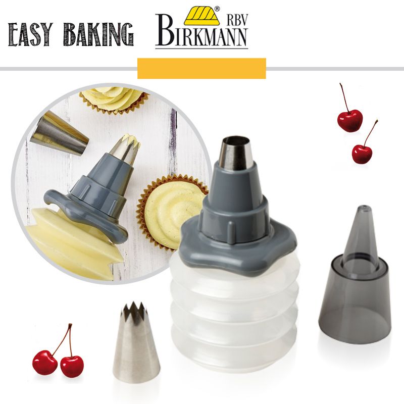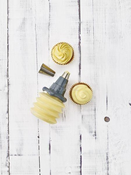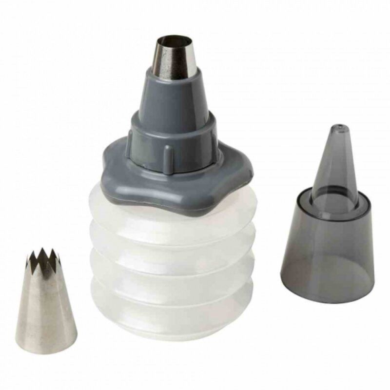 Ein fantastischer Helfer zum Verzieren von Cup-Cakes und Torten mit Cremes, Sahne oder Icings! Mit praktischer Verschlusskappe, damit übrig gebliebene Reste im Kühlschrank frisch bleiben. Das Wechseln der Tülle kann problemlos beim Verziervorgang erfolgen, zum schnellen Kreieren von Dekorationen!