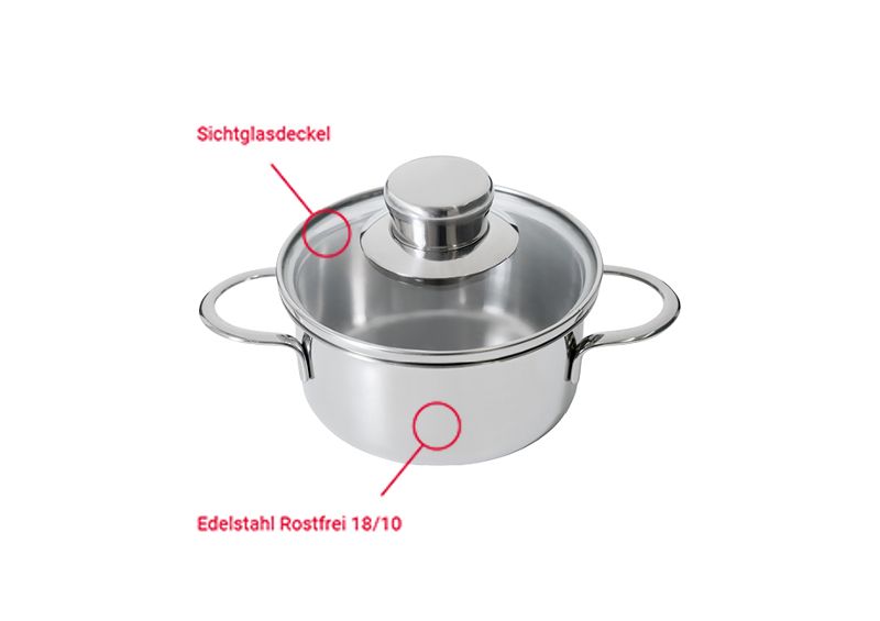 Manchmal ist ein kleiner Topf gerade richtig etwa wenn man für sich alleine oder nur eine Portion einer Speise kocht, Essensreste aufwärmt und vieles mehr. Der Bratentopf des MINI Kochgeschirrs ist aus hochwertigem Edelstahl 18/10 und der Sandwichboden verteilt die Hitze gleichmäßig. Der Glasdeckel sorgt dafür, dass man den Kochvorgang stets im Blick hat. Der Bratentopf ist in zwei Größen erhältlich und als Ergänzung gibt es auch noch die MINI Stielkasserolle zum Erwärmen von kleiner Menge an Flüssigkeiten wie Milch, Saucen, Suppen und die MINI Pfanne zum Braten von vielerlei kleinen Köstlichkeiten.