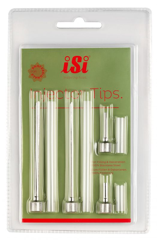 Die iSi Nadeltüllen eignen sich hervorragend zum Dekorieren, zum Füllen von Lebensmitteln, für flüssige Injektionen sowie zum Marinieren, Pikieren und Beizen. Die Nadeltüllen bitte ausschließlich mit original iSi-Geräten verwenden. Kombinierbar sind sie mit dem iSi Gourmet Whip und dem iSi Thermo Whip. Die Tüllen bestehen zu 100 % aus Edelstahl und sind spülmaschinenfest.