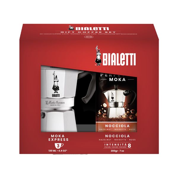 Bialetti Moka Express Espressokocher 3 Tassen + 200g Perfetto Moka Nocciola gemahlen