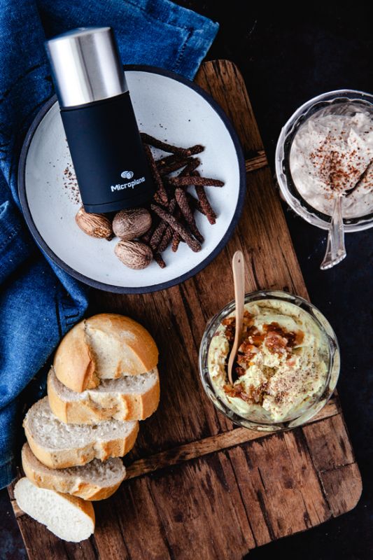 Mit dem Geriebenen lassen sich sowohl viele herzhafte Speisen wie Béchamelsoße, Gratins, Quiches oder Kartoffeln verfeinern als auch Süßes wie Kuchen oder Kekse. Aber auch kalte wie heiße Getränke erhalten mit den geriebenen Gewürzen eine unverwechselbare Note.