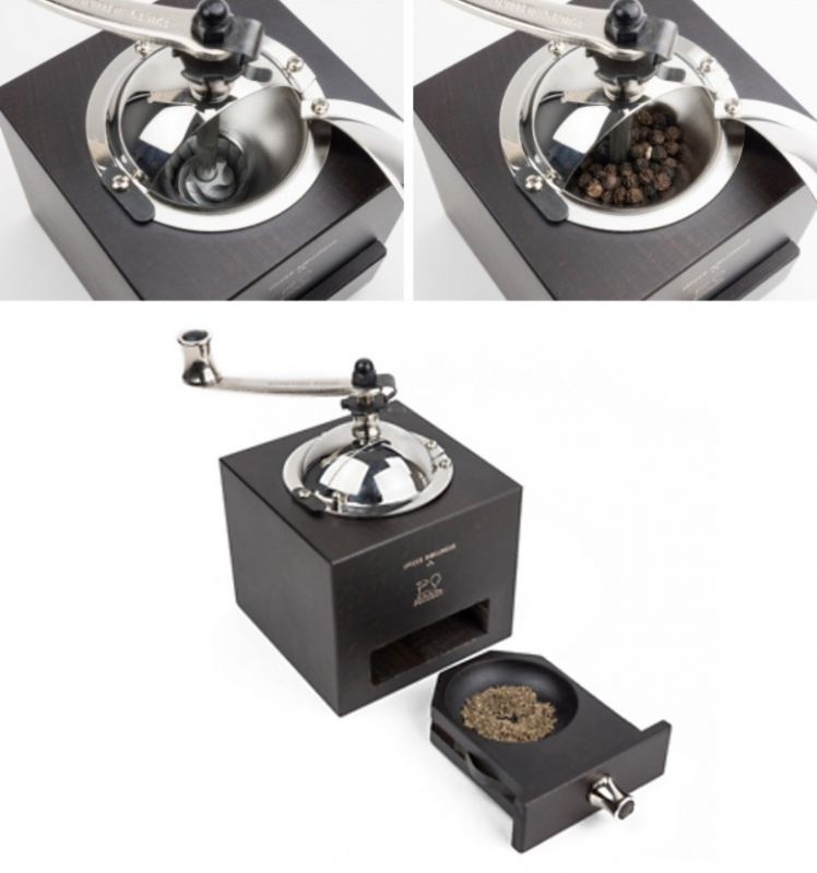 • Die Gewürzmühle ist am Boden geöffnet, so dass bei entfernter Schublade auch direkt über der