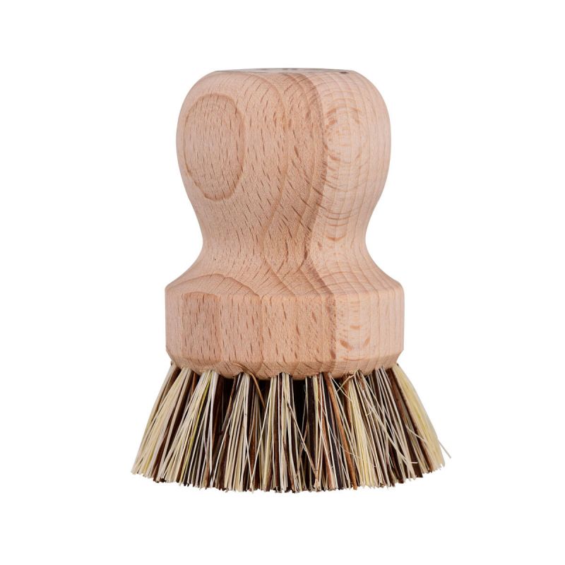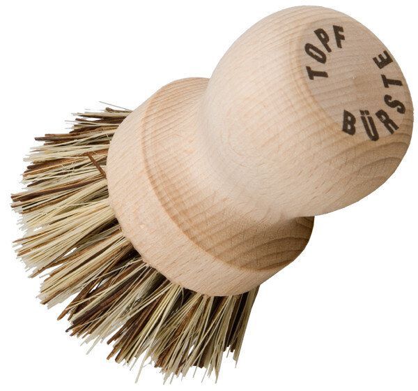 Topf-Bürste mit ergonomisch geformtem Holzgriff und besonders harten Naturfasern.
