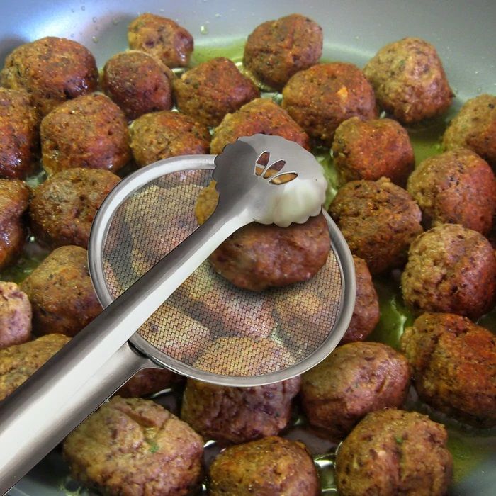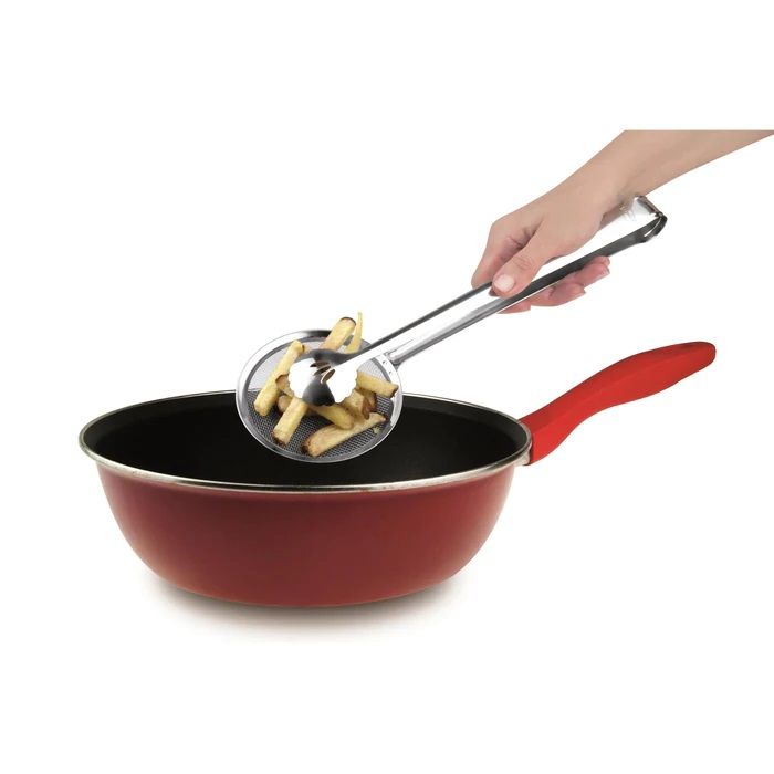 Seiherzange, das innovative Werkzeug mit langem Griff zum perfekten und sicheren Greifen und Abtropfen von Frikadellen, Pommes Frites, frittiertem Gemüse, Nuggets. Rostfreier Stahl. Spülmaschinenfest. Abmessungen 31,5 x 10 x 2,4 cm