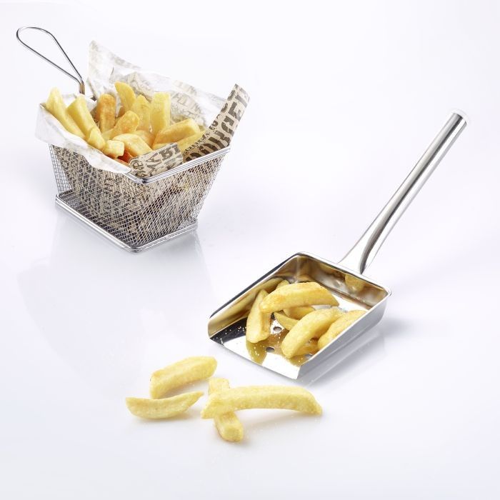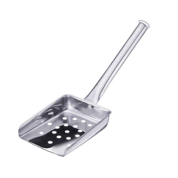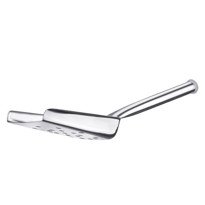 Die Profi-Schaufel aus Rostfreiem Edelstahl ist für eine intensive Beanspruchung beim Einsatz in der Profiküche oder Zuhause. Mit ihrer Hilfe lassen sich Pommes-frites im Restaurant oder Imbiss schnell und mühelos auf Teller, in Servierkörbchen oder in Tüten für unterwegs abfüllen. Nach dem Frittieren der Pommes kann die Edelstahlschaufel zum Durchmengen und Verteilen des Gewürz-Pulvers genutzt werden und die zusätzliche Lochung gewährleistet das Abtropfen von überschüssigem Fett beim Anrichten. Die Schaufel-Fläche hat einen abgerundeten und hochgezogenen Rand für ein zielgerichtetes, kinderleichtes Abfüllen. Sie ist ebenfalls ideal für das Eintüten von Gebäck und Konfekt in Supermärkten, Bäckereien und Co. geeignet und der lange, runde Griff sorgt für ein einfaches Handling.