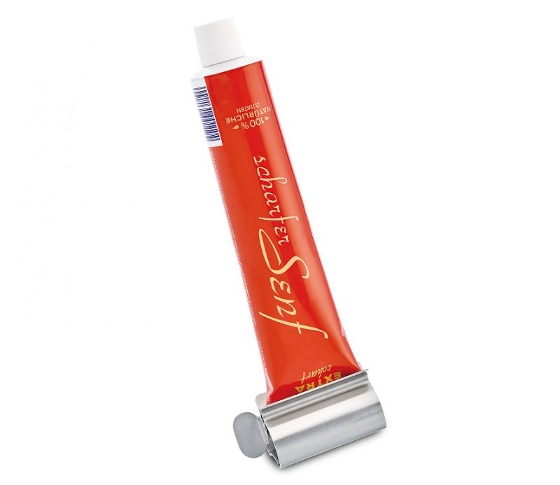 Wenn die Senftube fast leer ist, lässt sich der Rest nur mit Mühe herausquetschen. Und die duftende Bratwurst auf dem Teller wird in der Zwischenzeit kalt. Der KÜCHENPROFI Tubenausdrücker bringt Sie schnell ans Ziel, denn er ist mit einem Drehgriff ausgestattet. Der kraftvolle Küchenhelfer aus robustem Edelstahl leert Senf-, Tomatenmark-, Meerrettich- oder Mayonnaise-Tuben mühelos und gründlich. Stecken Sie einfach das Tubenende in die Hülle und drehen Sie am Griff. Der Trend geht übrigens zu einem zweiten Modell, denn im Badezimmer rollt der Tubenausdrücker die Zahnpastatube ordentlich auf und entschärft so ein Thema mit Konfliktpotenzial.