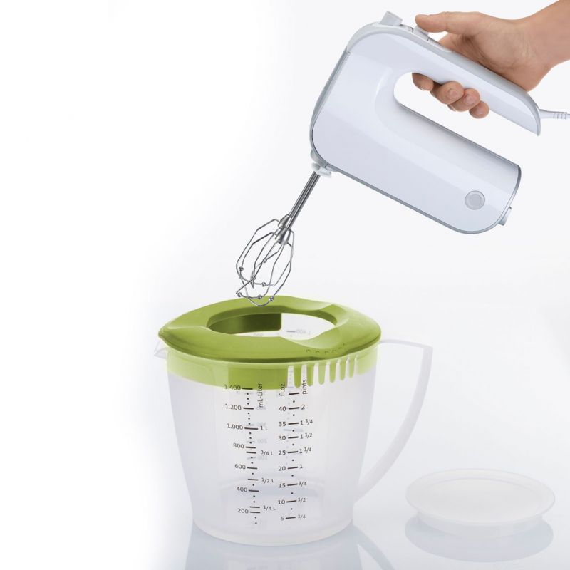 Der Quirltopf ist zum Mischen und Verrühren von Koch- und Backzutaten sowie zum Zubereiten von Eischnee und Sahne gedacht. Er hat 1,4 Liter Füllvolumen und eignet sich für Handrührgeräte mit zwei Rührbesen-Aufsätzen. Der zweigeteilte Deckel bietet einen Spritzschutz-Ring für sauberes Verquirlen und einen passgenauen Deckeleinsatz für hygienisches, geschmacks- und geruchsneutrales Aufbewahren von empfindlichen Zutaten. Ein einfaches Umgießen ist dank des praktischen Ausgießers möglich. Ein Gummiring an der Topfunterseite sorgt für Halt auf glatten Oberflächen. Durch den angenehm breiten Griff können Sie den Rührbecher gut in Position halten.