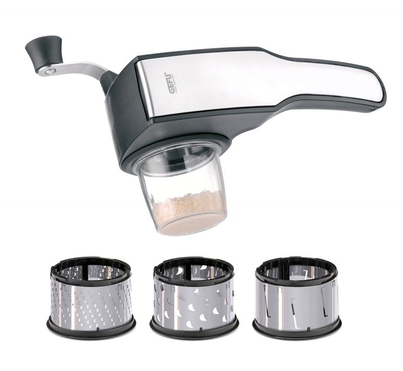 Trommelreibe vielseitig einsetzbar. Einfach Hartkäse, Nüsse oder Blockschokolade in den Einfülltrichter geben, Kurbel drehen - fertig. Praktisch ist