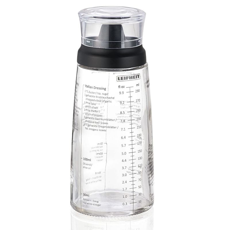 Der Grillabend beginnt und es fehlt noch ein raffiniertes Dressing für den Salat? Kein Problem für den edlen Dressing-Shaker von Leifheit! Wer diesen kauft, erhält ein innovatives Produkt mit 300 ml Füllvolumen inklusive hochwertigem Kunststoffdeckel zum sicheren Verschließen und Aufbewahren des Dressings. Der Glasbehälter ist spülmaschinenfest und mit Messskalierungen in ml und fl oz beschriftet. Hinzu kommen die nützlichen Rezeptskalen, die ebenfalls auf dem Glas aufgedruckt sind. Dies ermöglicht ein direktes Aufmessen in der Flasche des Salat-Dressing-Shakers. Dank des Anti-Tropf-Ausgusses werden unschöne Spritzer auf der Arbeitsfläche vermieden und die Hände bleiben während des Mixens sauber.