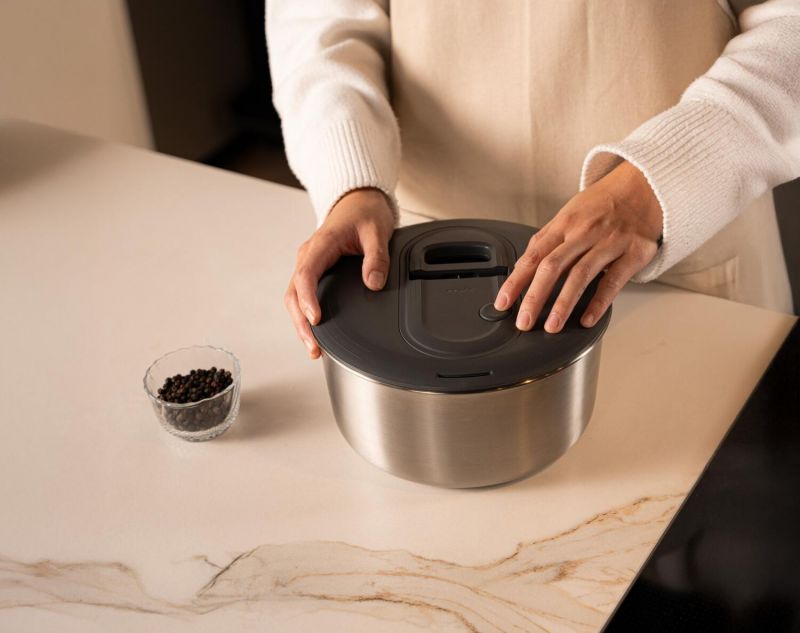 Die Easy Spin Salatschleuder von Zyliss ist der perfekte Küchenhelfer für alle, die frische Salate lieben und Zeit sparen wollen. Dank der praktischen Aquavent-Technologie werden überschüssige Wassertropfen sofort und schonend aus dem Salat geschleudert und Ihr Grünzeug bleibt knackig und frisch. Das einziehbare Zugseil sorgt für ein schnelles Drehen mit minimalem Krafftaufwand. Ein integriertes Bremssystem stoppt zuverlässig die Rotation, sobald das Wasser entfernt ist, das ist im Anschluss über einen Ausgießer simpel und tropffrei abgelassen werden kann. Nach dem Trocknen kann die Schüssel aus Edelstahl mit rutschfestem Boden zum Servieren benutzt werden. Ein flacher Deckel mit klappbarem Griff mit Magnetclip sorgt für platzsparende Aufbewahrung.