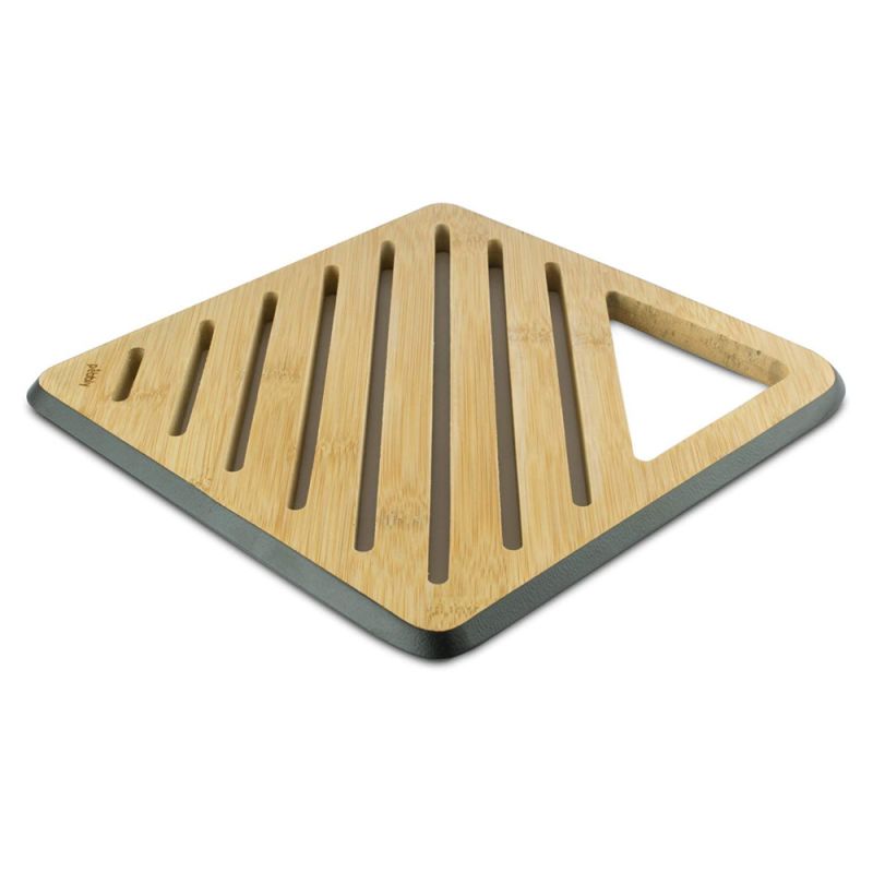 Der Pebbly Topfuntersetzer passt optisch perfekt zu den Pebbly Schneidbrettern. Der lackierte Rand aus umweltfreundlicher, lebensmittelechter Farbe verleiht den Produkten einen modernen und eleganten Look. Der Untersetzer besteht zu 100% aus natürlichem Bambus.