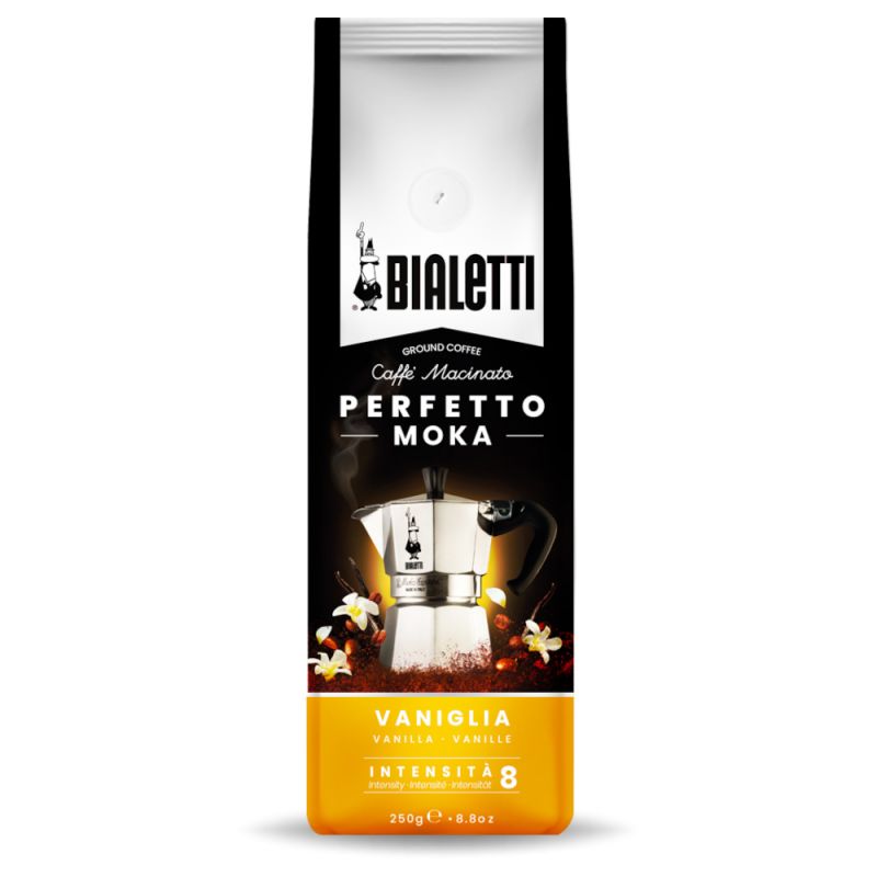 Bialetti Kaffee Perfetto Moka Vaniglia 250gBialetti vergibt für den Vanilla auf der Hausinternen Intensitätsskala eine 8/10, somit handelt es sich um ein kräftiges Geschmackserlebnis. Passend dazu weist das Ergebnis in der Tasse auch einen starken Körper auf. Das intensive Vanille-Aroma ist auf die Auswahl der Bohnen und die Zugabe von Vanille-Extrakt zurückzuführen.