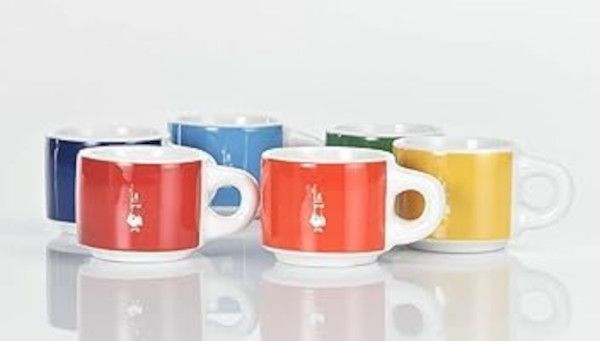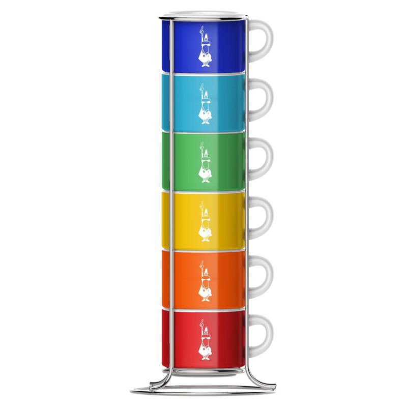 Set mit 6 stapelbaren Espressotassen in 6 leuchtenden Farben und Bialetto-Logo. Die Tassen können in dem Metallständer dekorativ aufgestellt werden.