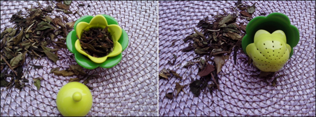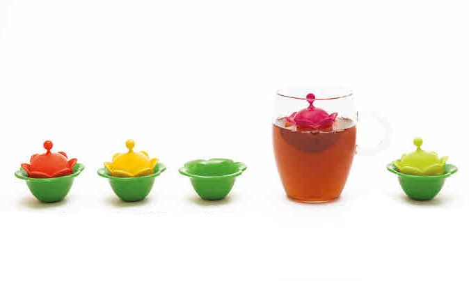 Farbenfrohes Tee-Ei aus Melamin. Es wird einfach mit lsem Tee gefüllt, nach der Ziehzeit kann es auf dem dazugehörenden "Blätterkelch" abtropfen.