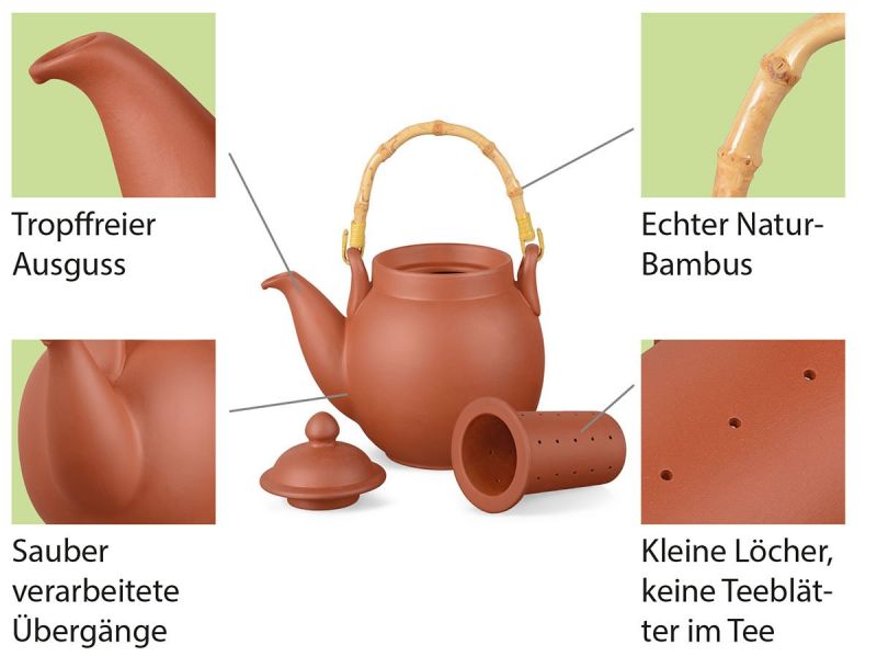 Naturton: Die Kanne ist völlig naturbelassen (innen und außen unglasiert). Keine Metallteile in der Kanne! Auch der Filter ist aus Naturton. Auf Lebensmittelechtheit geprüft. Farbabweichungen einzelner Elemente sind möglich.