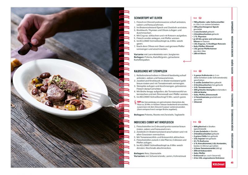 Im Buch finden sich Kochtipps für das Kochen mit dem Schnellkochtopf und eine ausführliche Kochzeitentabelle. Im KELOMAT Kochbuch werden weiters die Grundregeln für das Kochen im KELOMAT Schnellkochtopf sowie Gebrauch und die Pflege des Schnellkochtopfs erklärt.