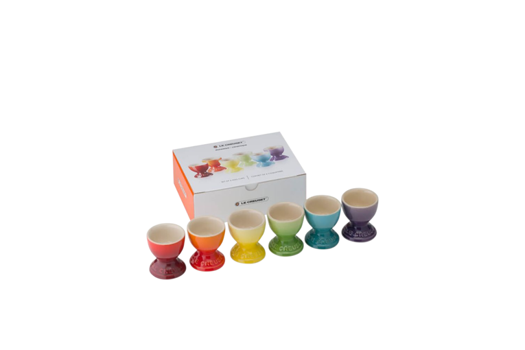 Gekochte Eier sind ein Must auf jedem Frühstückstisch – einfach, aber köstlich. Genauso wie das farbenfrohe Eierbecher-Set aus unserer Rainbow Collection. Kirschrot. Ofenrot. Citrus. Palm. Karibik. Ultra Violet. Diese sechs Farben entfalten gemeinsam einen fantastischen Effekt.Immer in einem guten Zustand: Unser emailliertes Steinzeug ist kratzfest und leicht zu reinigen.