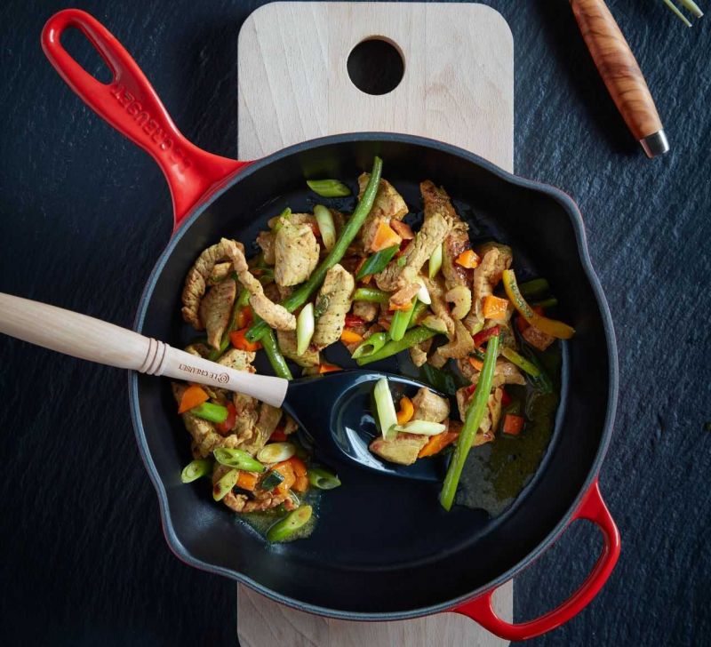 Wir empfehlen die Verwendung von Le Creuset Küchenhelfern aus Silikon. Sie bieten großen Komfort beim Umrühren und schützen die Emailleoberfläche. Metallische Gegenstände, Löffel und Schneebesen sollten nur mit äußerster Vorsicht verwendet werden, jedoch nicht kratzend auf der Emailleschicht. Diese nicht am Produktrand abklopfen. Batterie- oder strombetriebene Rührgeräte sollten nicht verwendet werden, da ihre Klingen die Emailleschicht beschädigen könnten. Messer und andere Gegenstände mit scharfen Kanten sollten nicht zum Schneiden von Lebensmitteln in dem Kochgeschirr benutzt werden.