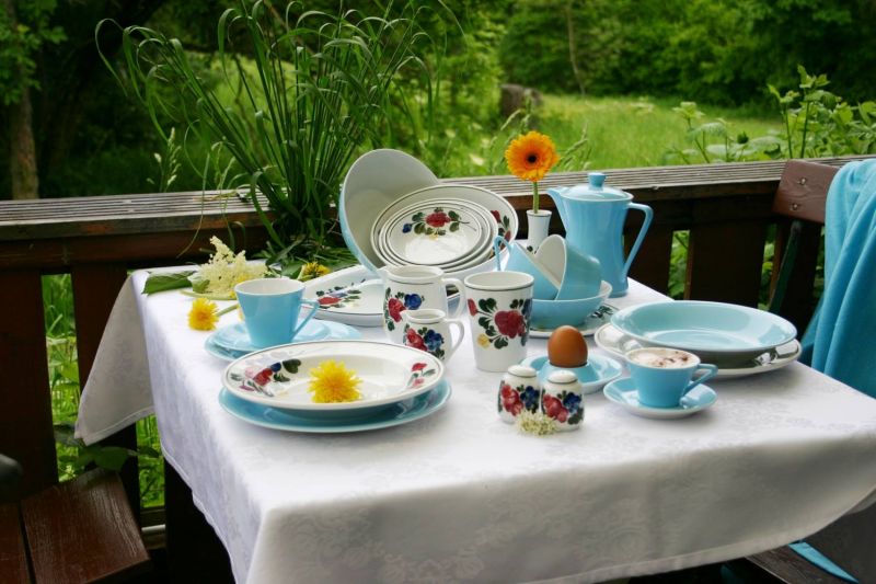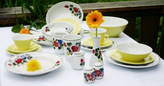 Ganz modern wirken die traditionellen Blumenmuster kombiniert mit "Daisy", dem Kult-Klassiker von Lilienporzellan! Am besten passt "Alpenflora" zu Daisy in Vanille oder Lasurblau.