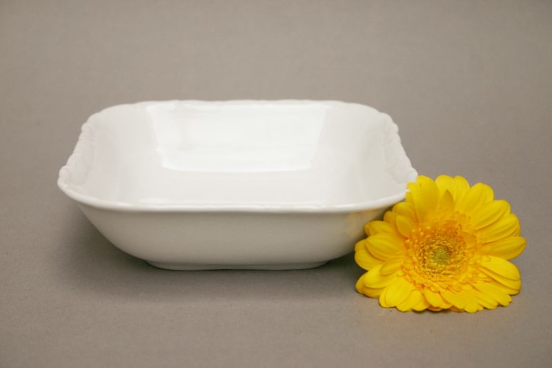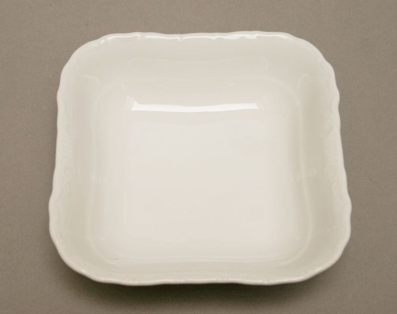 Kleines Servierschälchen in eckiger Form aus feinem Bohemia Porzellan. Das ornamentale, zarte Reliefmuster verleiht der Schale das gewisse Etwas. Zum Servieren von Dips und Knabbereien, zum Fondue und Raclette wie auch zum Aufbewahren oder als Ringschale schön!