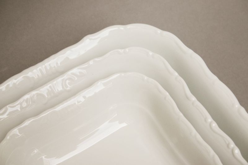 Wir führen Fleischteller, Suppenteller und Dessertteller, Suppenterrine und Suppenschalen, Schüsseln, Schalen und Platten in verschiedenen Formen und Größen, Kaffeetassen und Unterteller, Zuckerdosen, Milchgießer und vieles mehr.