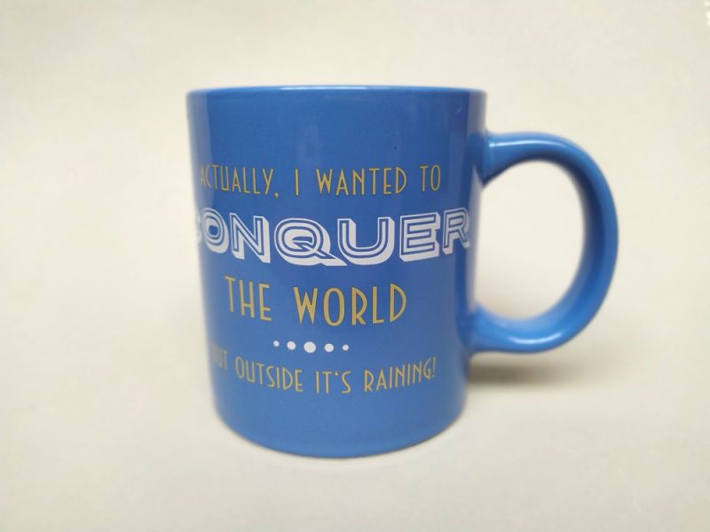 Blauer großer Kaffeebecher mit Aufdruck: "Actually, I wanted to conquer the world, but outside it's raining"