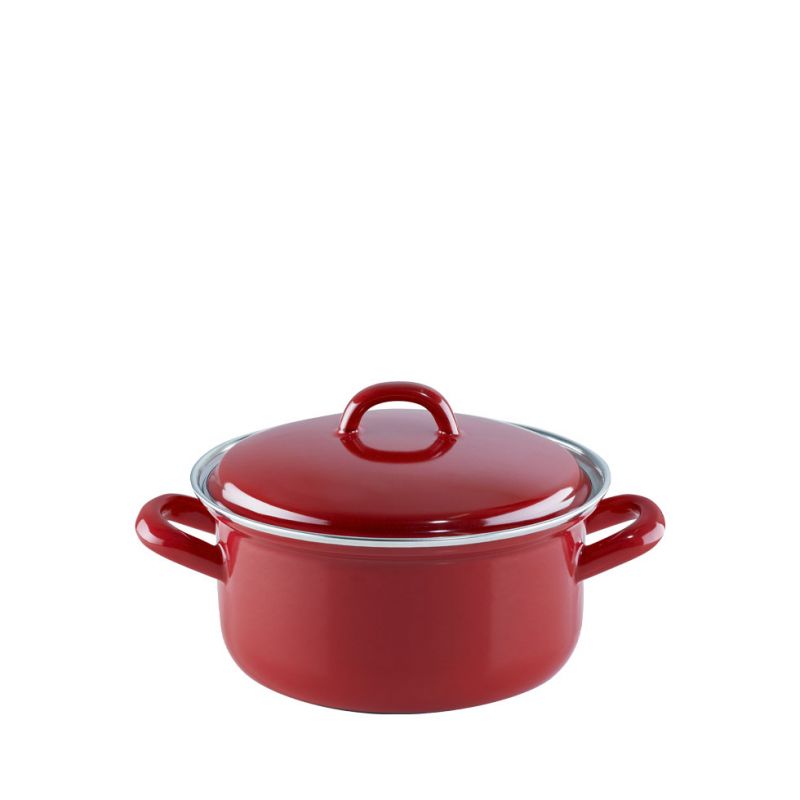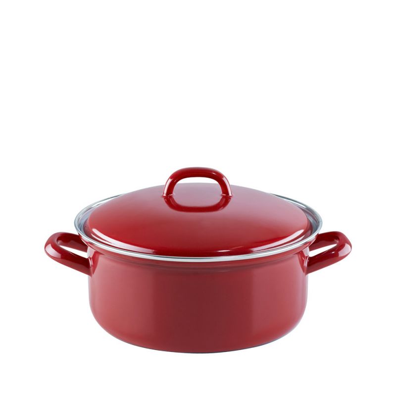 Die klassische Form unsere Emaille Kasserollen mit Deckel haben einen gerade Form und die klassischen Emaillegriffe. Der Deckel liegt auf der Kasserolle gut auf und fungiert als Energiewächter: sobald der Deckel zu klappern beginnt, ist es Zeit die Hitze zur reduzieren und so Strom zu sparen. Je nach Herde kann ca. 5 Minuten vor Garende vollständig abgeschaltet werden, da Emaille die Hitze lange speichert. Daher empfehlen wir wärmstens Topflappen zum Heben der Töpfe und Deckel zu verwenden, da auch die Emaillegriffe die Wärme speichern. Der Vorteil der Emaillegriffe ist jedoch, dass man den Topf auch getrost zum Warmhalten in das Backrohr schieben. Der Rand der Kasserolle ist mit einem robusten Chromrand versehen.