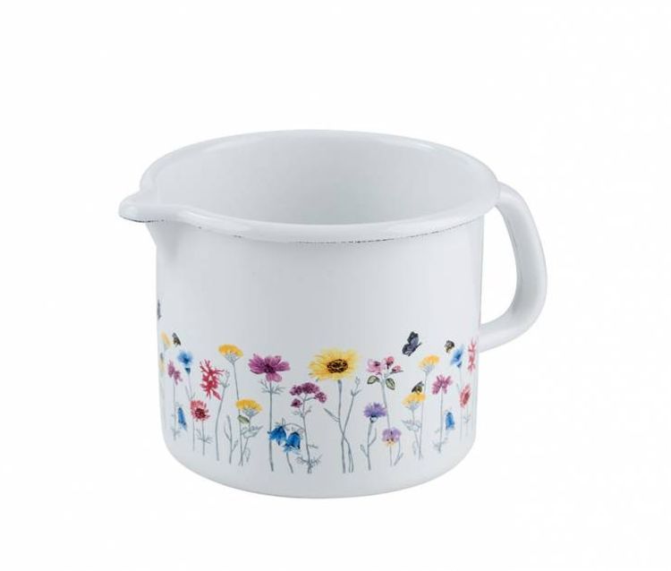 Der Schnabeltopf mit Henkel und Ausgießer ist in 3 Größen erhältlich, für alle Bedürfnisse. Als Wasserkrug, als Töpfchen, Milchtopf, zum Servieren oder als praktisches Camping-Geschirr, Emaille ist strapazierfähig, robust, leicht zu reinigen und hitzebeständig. So ist der Schnabeltopf sowohl als Krug und Becher als auch als Kochtopf verwendbar - mit frühlingshaftem Blumendekor.