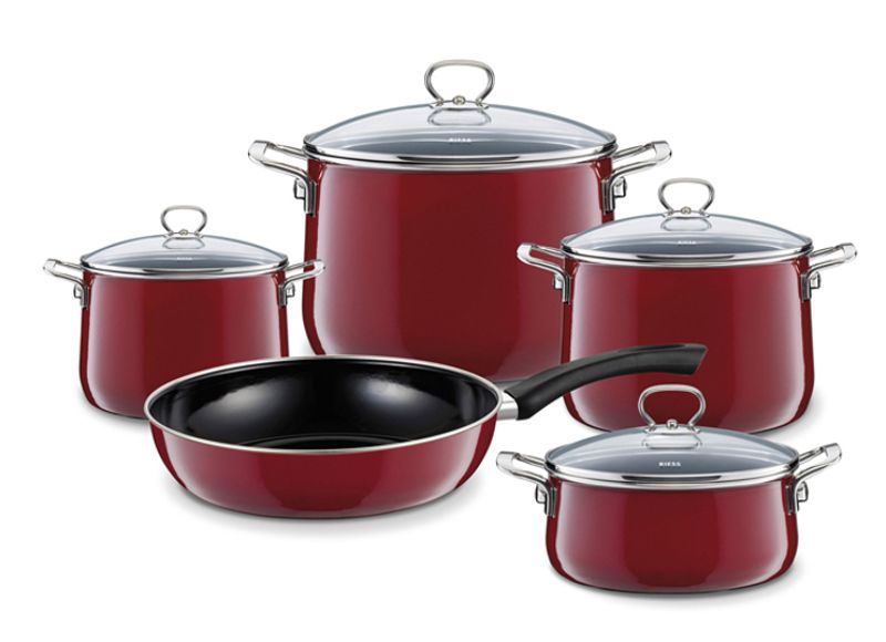 bestehend aus Fleischtopf mit Glasdeckel 16, 20 und 24cm, Kasserolle mit Glasdeckel 20cm, Emaille Pfanne 28cm