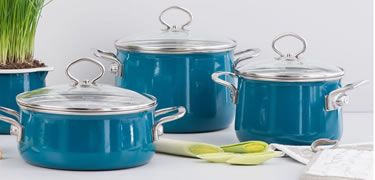 Edles Blau in unserer Top-Qualität - für all jene, denen gedeckte Farben, moderne Formen und hohe Funktionalität wichtig sind. Emaillegeschirr mit extra starkem Stahl-Wärmespeicherboden* und Deckel aus Glas.