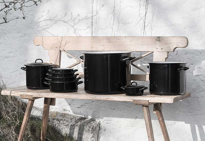 Übergroße und kleinwinzige Töpfe aus Emaille mit extrastarkem Eisenblech ummantelt von edelstem Glas. Außen erdig schwarz und granitgesprenkelt innen. Universelle Kochstellen-Eignung: Induktion, Glaskeramik, Elektroherd, Gasherd, Bratrohr. Einfache Reinigung.