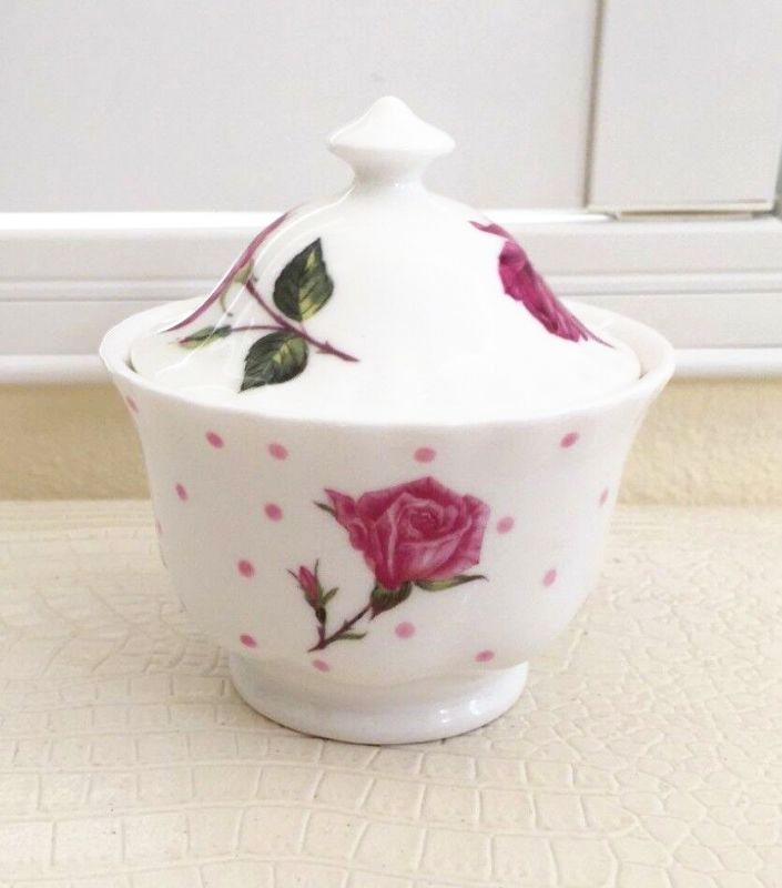 Die Zuckerdose mit romantischem Rosenmotiv und Pünktchen hat einen Deckel mit Ausschnitt und verschönert jede Kaffeetafel.