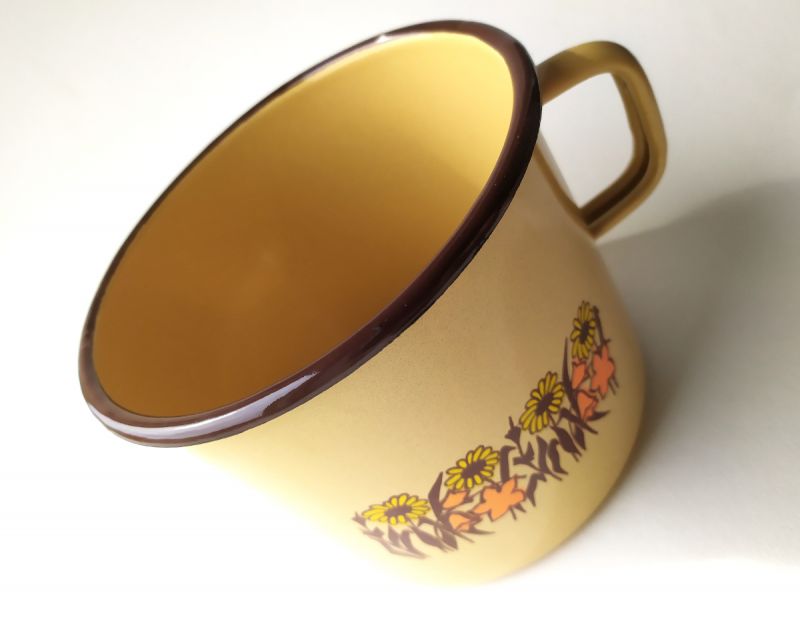 Der kleine Milchtopf mit Henkel hat einen für Email-Geschirr typischen gebogenen Bördel-Rand und kommt in wunderschön warmen Farben.